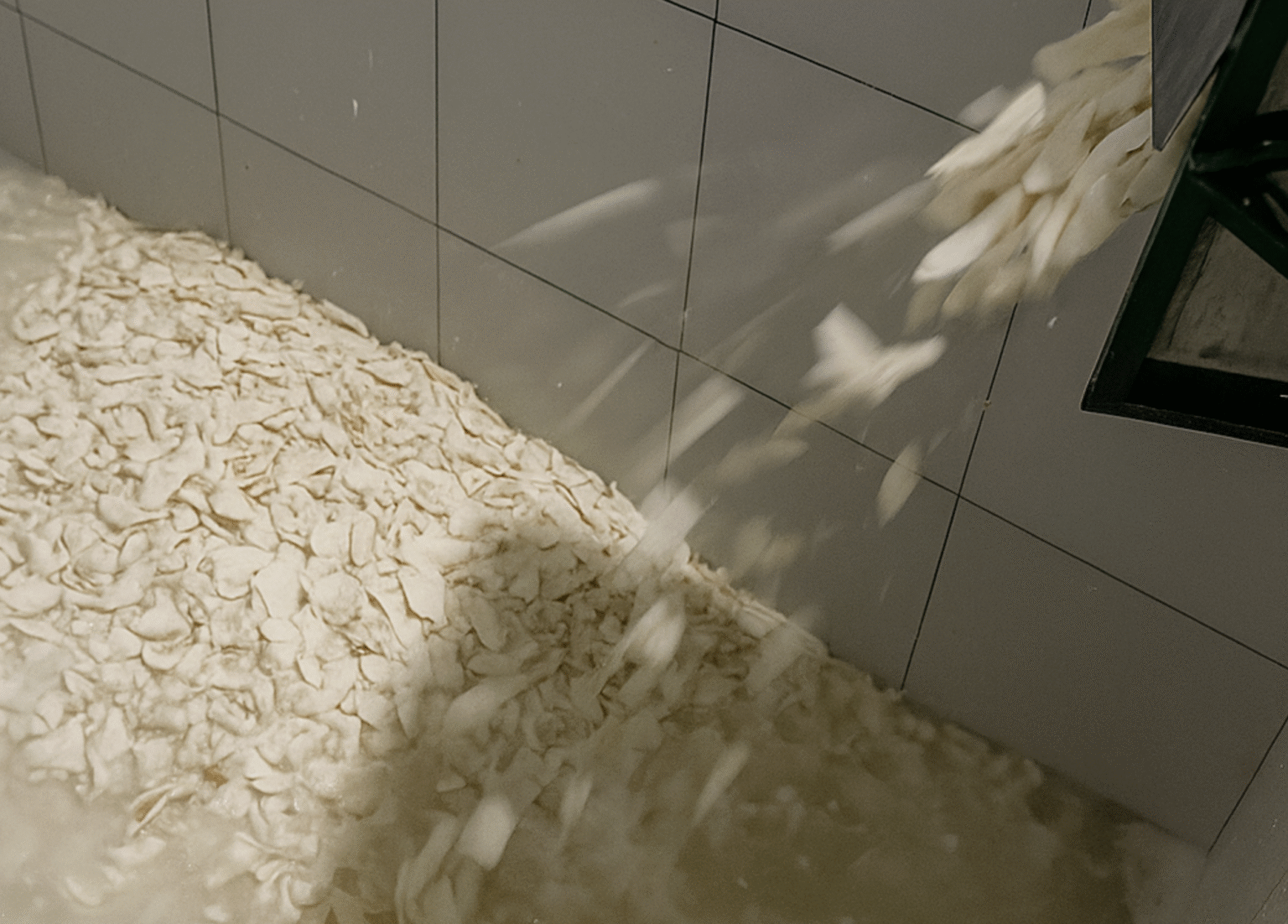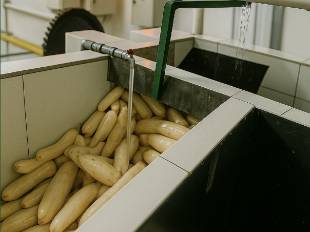 After selection, the cassava undergoes a natural soaking process for a set period. This helps reduce its natural bitterness, improves digestibility, and results in better flour texture.